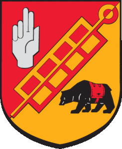 Taillé de gueules et d’or à un gril de mêmes et de l’un en l’autre posé en barre, accompagné en chef d’une main appaumée d’argent posée en fasce le poignet à dextre, en pointe d’un ours passant de sable sellé de gueules .